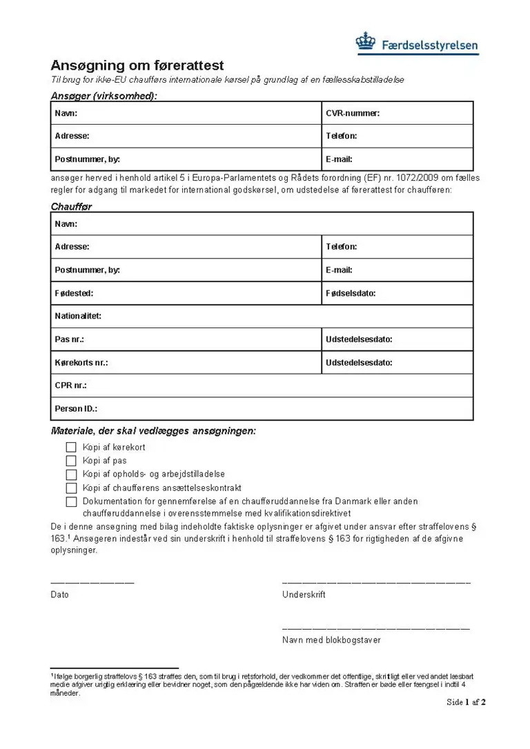 Brug denne blanket når du du søger om førerattest til tredjelandschauffør