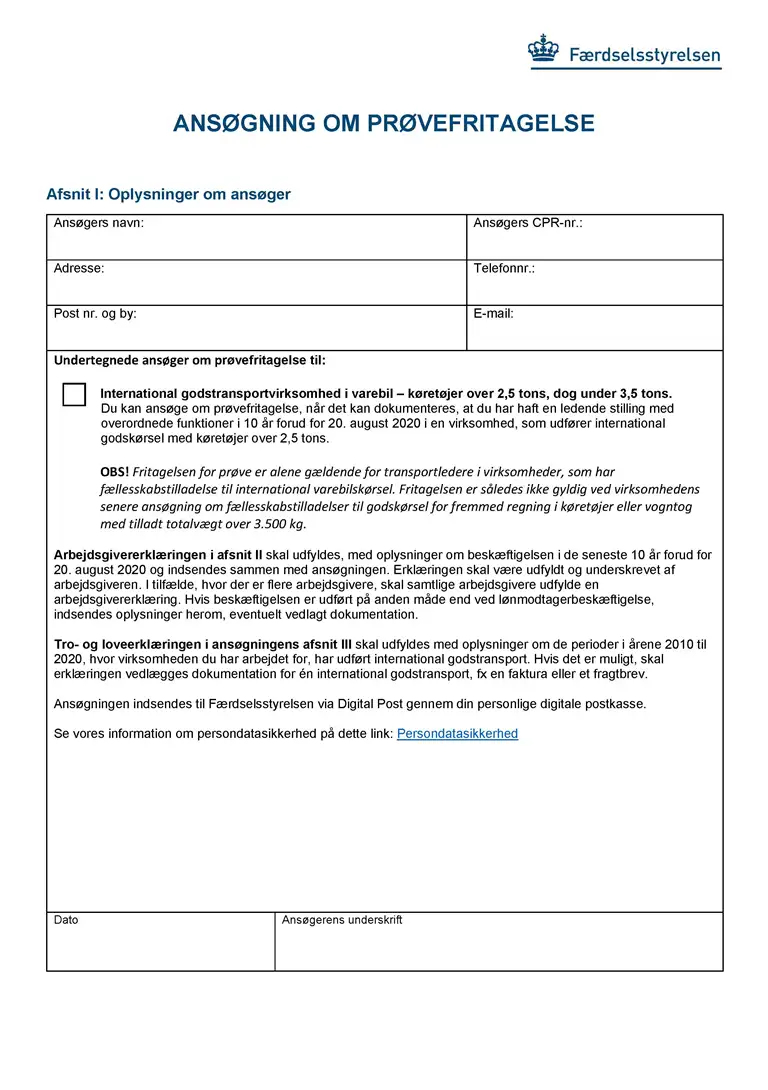Udfyld ansøgning om prøvefritagelse i afsnit I. Afsnit II skal udfyldes af din arbejdsgiver med oplysninger om din beskæftigelse. Afsnit III skal udfyldes med oplysninger om de perioder i årene 2010 til 2020, hvor virksomheden har udført international godstransport