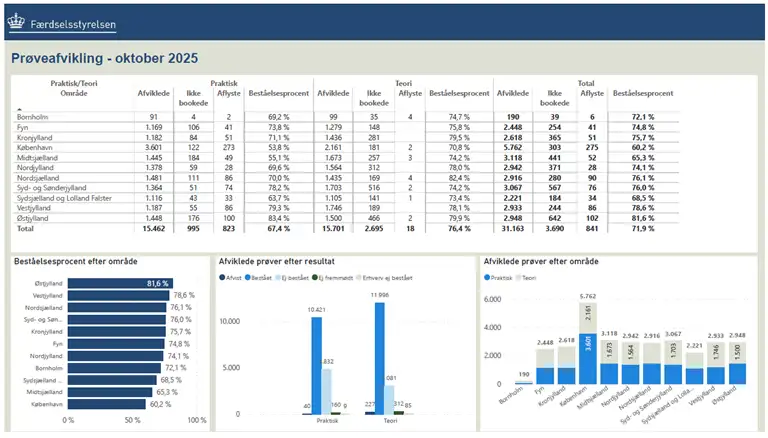 Her kan du se statistikker for hver måned over køreprøveafholdelse, geografisk, hvor mange prøver som er afholdt som planlagt, ikke fremmødt mv.