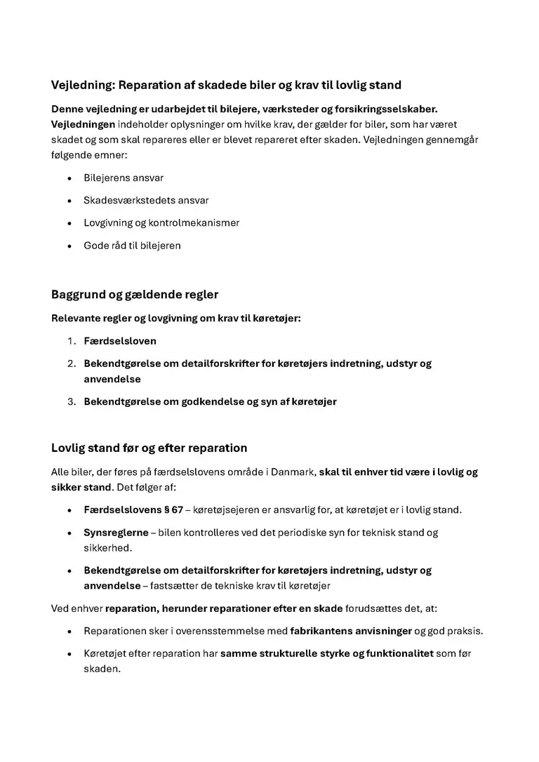 Vejledningen indeholder oplysninger om hvilke krav, der gælder for biler, som har været skadet og som skal repareres eller er blevet repareret efter skaden