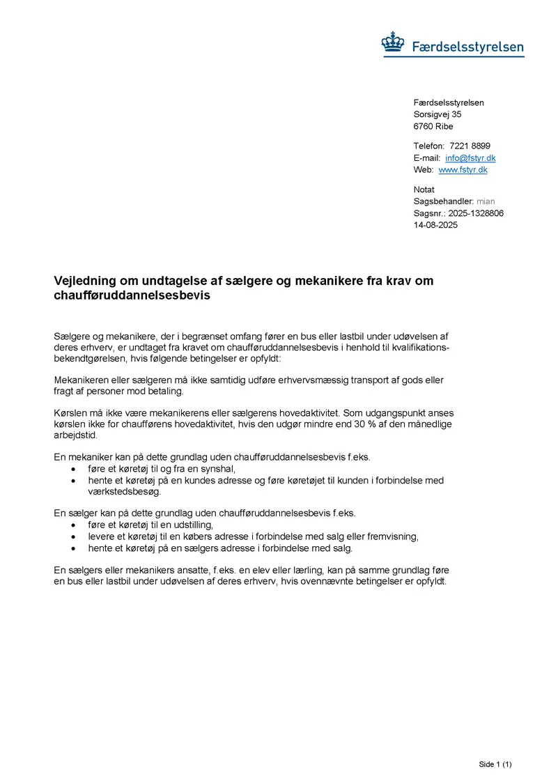 Sælgere og mekanikere, der i begrænset omfang fører en bus eller lastbil under udøvelsen af deres erhverv, er undtaget fra kravet om chaufføruddannelsesbevis i henhold til kvalifikationsbekendtgørelsen, hvis følgende betingelser er opfyldt: