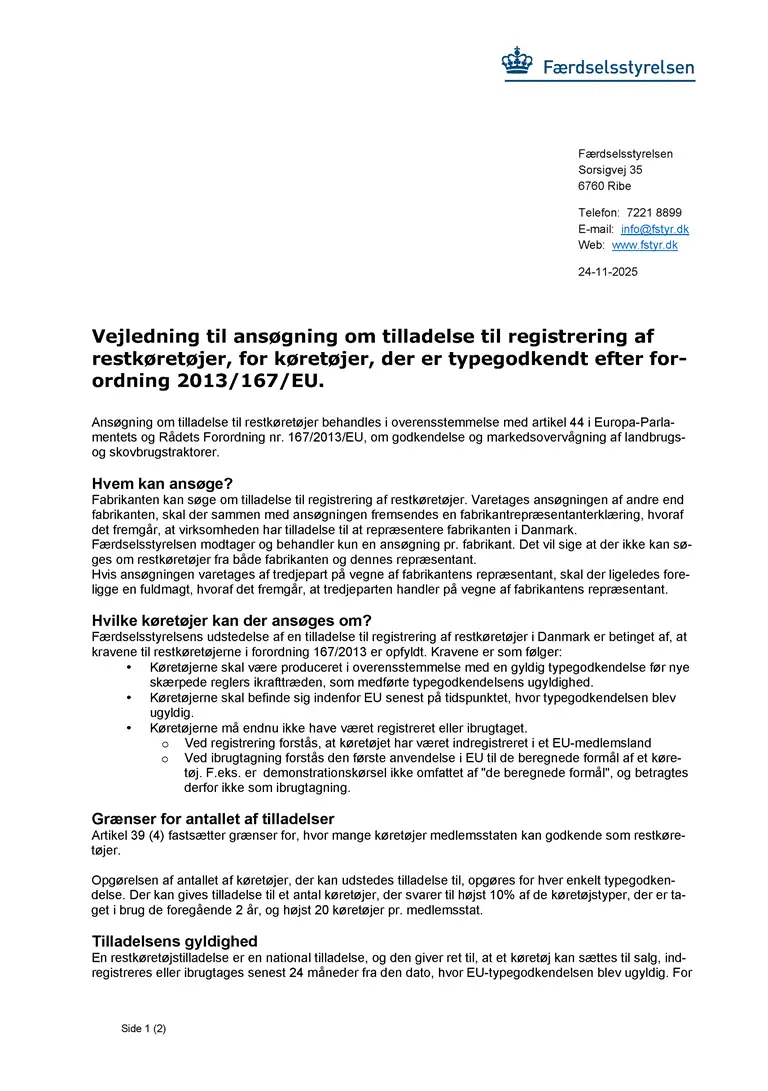 Vejledning til ansøgning om tilladelse til registrering af restkøretøjer, for køretøjer, der er typegodkendt efter forordning 2013/167/EU.
